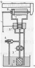 1-油箱2-過(guò)濾器3-液壓泵4-溢流閥5-伺服閥6-操縱手柄7-活塞8-液壓缸9-工作臺(tái)