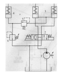 1-定量液壓泵;2-三位四通手動(dòng)換向閥;3-左離合器液壓缸; 4-液壓制動(dòng)器;5-溢流閥;6-順序閥