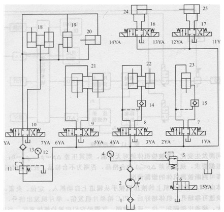 1-過濾器;2-定量液壓泵;3、13-單向閥,4、12-壓力表;5-先導(dǎo)式溢流閥; 6-二位二通電磁換向閥;7、8、9、10、16、17-三位四通電磁換向閥;11-減壓閥; 14、15-液控單向閥;18-左堵孔液壓缸;19-右堵孔液壓缸, 20-前端堵扎液壓缸; 21-夾緊液壓缸;22-舉升液壓缸;23-抓舉液壓缸;24-接件液壓缸;25-限位液壓缸