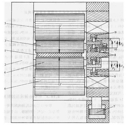 圖1所示為板帶軋鋼機(jī)彎輥及平衡裝置的工作示意圖。圖中1為被軋板帶,2為機(jī)架,3為上工作輥,4為下工作輥,5為上支承輥,6為下支承輥,10為支承輥平衡液壓缸。正彎輥液壓缸8所產(chǎn)生的正彎輥力F1的方向與負(fù)彎輥液壓缸9所產(chǎn)生的負(fù)彎輥力F2的方向是相反的,所以這兩組液壓缸是根據(jù)板型偏差控制的要求,分別施加但不同時(shí)施加力F1和F2。改變彎輥液壓缸的工作壓力就可對彎輥力進(jìn)行連續(xù)控制。工作輥平衡力F3的方向和正彎輥力F1的方向是一致的,只是平衡力遠(yuǎn)小于彎轉(zhuǎn)力。只要將控制正彎輥力的液壓力降低,正彎輥液壓缸就起到平衡缸的作用。在穿帶操作時(shí),所有彎輥液壓缸的有桿腔和無桿腔都引入低壓油,使工作輥處于有阻尼的浮動狀態(tài)。