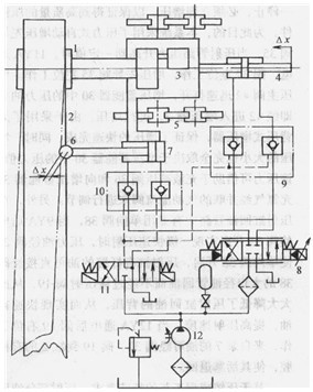 圖3為帶鋼卷取機(jī)跑偏控制裝置原理及液壓系統(tǒng)圖。卷取機(jī)的卷筒1將連續(xù)運(yùn)動的帶鋼2卷取成鋼卷,帶鋼在卷取機(jī)前產(chǎn)生隨機(jī)跑偏量△x。卷取機(jī)及其傳動裝置安裝在平臺3上,在主液壓缸4的驅(qū)動下平臺3沿導(dǎo)軌5在卷筒軸線方向產(chǎn)生的軸向位移為△xp。跑偏量△x在跑偏傳感器6感受后產(chǎn)生相應(yīng)的電信號輸入液壓控制系統(tǒng)使卷筒產(chǎn)生相應(yīng)的位移即糾偏量△xp,使△xp跟蹤△x,以保證卷取鋼卷的邊緣整齊。主液壓缸4和跑偏傳感器液壓缸7都由電液伺服閥8進(jìn)行控制。液控單向閥組9、10及換向閥1l組成轉(zhuǎn)換油路,12為油源。系統(tǒng)投入工作前先使跑偏傳感器液壓缸7與電液伺服閥8相通,使跳偏傳感器自動調(diào)零,然后轉(zhuǎn)換油路使主液壓缸4與電液伺服閥8相通,系統(tǒng)投入正常工作。