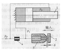 圖6-42所示為噴嘴.擋板裝置的工作原理。它由噴嘴3、擋板2和液壓缸1組成。液壓泵來的壓力油p。一部分直接進(jìn)入液壓缸1有桿腔,另一部分經(jīng)過固定節(jié)流孔a進(jìn)入液壓缸1的無桿腔,并有一部分經(jīng)噴嘴一擋板間的間隙6流回油箱。當(dāng)輸入信號(hào)使擋板2的位置(亦即是鰳改變時(shí),噴嘴.擋板間的節(jié)流阻力發(fā)生變化,液壓缸1無桿腔的壓力p.亦發(fā)生變化,液壓缸1就產(chǎn)生相應(yīng)的運(yùn)動(dòng)。