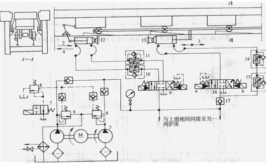 加熱爐內(nèi)共有兩列爐床,每列爐床的液壓操作回路相同,故在圖1上僅繪出了一列爐床的液壓操作回路。