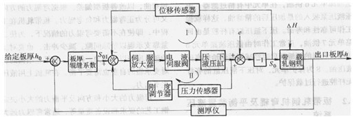 始輥縫的給定調(diào)節(jié)量So1。由伺服放大器、電液伺服閥、壓下液壓缸和位移傳感器所形成的位置控制閉環(huán)I使初始輥縫So的大小能跟蹤給定調(diào)節(jié)量Sol;由伺服放大器、電液伺服閥、壓下液壓缸和壓力傳感器、剛度調(diào)節(jié)器所形成的軋制力反饋閉環(huán)Ⅱ則使初始輥縫So1的給定值補(bǔ)償了對軋機(jī)的彈跳。軋機(jī)的初始輥縫So的大小也就決定了帶載軋機(jī)的出口板厚h。實際上影響出口板厚和初始輥縫之間關(guān)系的因素較多,如板帶進(jìn)入軋機(jī)的厚度及變形抗力變化等因素,用干擾量△H加以考慮;軋輥的幾何偏心量用e加以考慮。在整個控制系統(tǒng)中只要設(shè)計合理就能滿足高速軋機(jī)等厚度控制的要求。