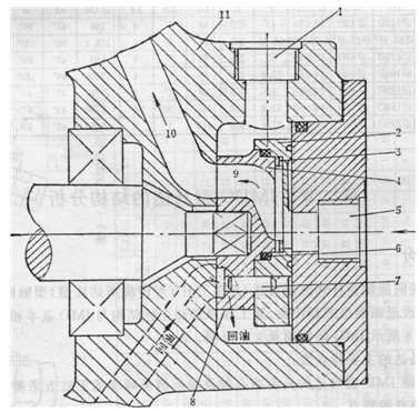 1-回油孔;2-壓力盤;3一片彈簧;4-配流盤;5-進(jìn)油孔;6-0型密封圈 7-定位銷;8-配流盤的缺口;9、10 -流道;11 -殼體(缸體);12-端蓋