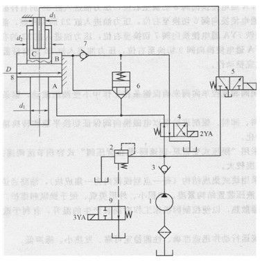 1-定量液壓象.2先導(dǎo)式溢流閥;3、7-單向閥;4二位四通電磁換向閥;5-二位二通電磁換向閥;6-插裝閥; 8-三腔復(fù)合液壓缸;9-二位二通電磁換向閥