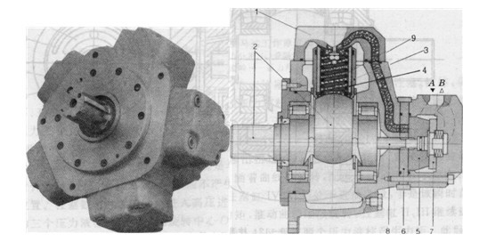 1-缸蓋;2-偏心軸;3-缸套;4-柱塞;5-配流盤;6一配流隔順; 7一浮動(dòng)環(huán);8-十字滑塊軸端;9-彈簧