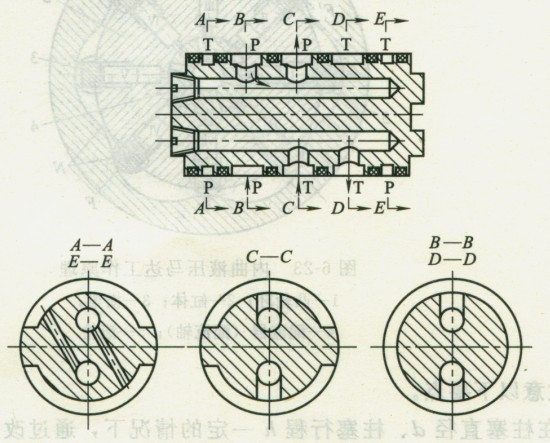 ③配流副。圖1所示馬達(dá)為軸配流。由于配流軸的一側(cè)為高壓腔,另一側(cè)為低壓腔,故配流軸工作過(guò)程受到很大的徑向力,此徑向力將配流軸推向一側(cè),而使另一側(cè)間隙加大,造成滑動(dòng)表面的磨損和泄漏量的增加,致使效率下降。為此,常采取開(kāi)設(shè)對(duì)稱(chēng)平衡油槽的措施以平衡徑向力。例如圖1所示為采用密封環(huán)密封的靜壓平衡配流軸的原理,C-C窗口是配流窗孔,B-B和D-D上的環(huán)形槽分別是進(jìn)油和回油窗孔,A-A和E-E是靜壓平衡半圓環(huán)形槽。假定各密封環(huán)分別放置在密封帶的正中。若進(jìn)、出油方向如圖中箭頭所示,各孔標(biāo)有符號(hào)P的都是高壓腔,標(biāo)有符號(hào)T的都是低壓腔??梢?jiàn),B-B和D-D圓周方向的壓力都相同,沒(méi)有徑向力產(chǎn)生;C-C窗孔剖面的上腔與進(jìn)油口相通,是高壓側(cè),下腔與回油相通,是低壓側(cè),因此使配流軸受到很大的徑向力。為了平衡這個(gè)徑向力,在配流軸兩端設(shè)置半圓平衡油槽A-A和E-E,使其上腔通高壓油,為了減小泄漏,各腔之間設(shè)有密封環(huán)。為了保證上、下兩側(cè)靜壓平衡,配流窗口和平衡油槽的相關(guān)尺寸應(yīng)滿足如下關(guān)系式
