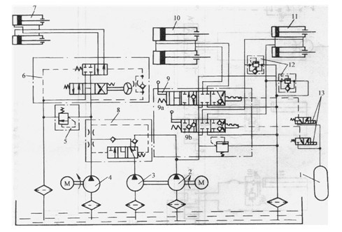 1一儲氣罐2、3雙聯(lián)液壓泵4-轉(zhuǎn)向液壓泵5-溢流閉6-轉(zhuǎn)向控制閥7-轉(zhuǎn)向液壓缸8流量控制閥9多路換向閥10-動臂液壓缸11-翻斗液壓缸12-雙溢流閥13電磁閥