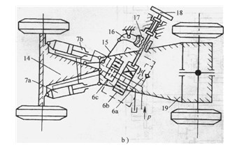 轉(zhuǎn)向時,前車架棚對后車架左右擺動。轉(zhuǎn)向動作由液壓缸7a和7b驅(qū)動,這兩個液壓缸的有桿腔和無桿腔互聯(lián),一個液壓缸的有桿腔和另一個液壓缸的無桿腔同時進(jìn)、排油??刂崎y6a和6b控制著轉(zhuǎn)向液壓缸的動作。當(dāng)轉(zhuǎn)動方向盤18時,帶動轉(zhuǎn)向螺母旋轉(zhuǎn),轉(zhuǎn)向螺母帶動控制閥6a的閥芯,但閥芯受機械結(jié)構(gòu)限制并不轉(zhuǎn)動,僅作軸向運動,使閥口有一個開度。提供給轉(zhuǎn)向系統(tǒng)的高壓油推開切斷控制閥6c,進(jìn)入轉(zhuǎn)向液壓缸。液壓缸運動時通過反饋桿15、轉(zhuǎn)向臂16帶動轉(zhuǎn)向螺母反向旋轉(zhuǎn),使打開的閥口關(guān)閉,從而達(dá)到一個新的平衡。切斷控制閥6c的作用是:當(dāng)方向盤不動時,路面引起的干擾力不能使前支架擺動。單向節(jié)流閥的設(shè)置使得切斷閥的動作打開時動作迅速,切斷時比較緩慢,這有利于防止液壓沖擊。