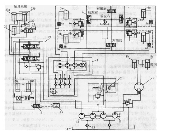 1-升降系統(tǒng)液壓泵2一升降換向閥3-同步馬達(dá)4-液控單向閥5a、5b一后左右升降缸6a、6b-右后、左后平衡閥7-微調(diào)同步閥8a、8h-轉(zhuǎn)向助力液壓缸9-轉(zhuǎn)向控制閥10-溢流閥11-轉(zhuǎn)向系統(tǒng)液壓泵12-吊具操縱液壓泵13過濾器14-油箱15-壓力繼電器16-浮動控制閥17-吊具擺動控制閥18a、18b-前后側(cè)移液壓缸19-側(cè)移轉(zhuǎn)鎖控制閥20-40ft (12.2m)吊具轉(zhuǎn)鎖液壓缸21-吊具轉(zhuǎn)換閥22一單向閥23a、23b-前后20ft (6.1m)吊具轉(zhuǎn)鎖液壓缸