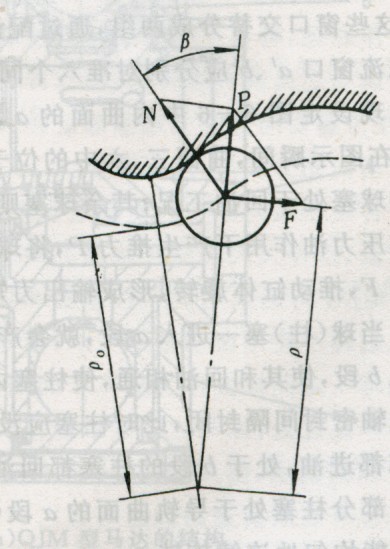 它由轉(zhuǎn)子缸體2、導(dǎo)軌3和柱塞5-鋼球1組成的球塞副、配流軸.4、外殼6等組成。圖1為具有10球塞六作用次數(shù)的馬達(dá)。所謂作用次數(shù)z,即每個(gè)球塞隨轉(zhuǎn)子轉(zhuǎn)一轉(zhuǎn)往復(fù)的次數(shù),也即導(dǎo)軌所具有的曲線凹凸數(shù)。配流軸4的作用是依次將高壓油分配給各球塞,并將低壓油從各球塞依次通過配流軸排出。柱塞5在高壓油推動(dòng)下,帶動(dòng)鋼球1沿徑向向外運(yùn)動(dòng),與曲線導(dǎo)軌3接觸,鋼球1與導(dǎo)軌曲線的相互作用如圖6-5所示。柱塞副所產(chǎn)生的液壓力P是沿柱塞軸線的。該力分為兩個(gè)力Ⅳ與F,Ⅳ力與導(dǎo)軌曲線相垂直,并與導(dǎo)軌曲線的反力相平衡。分力F即為推動(dòng)缸體旋轉(zhuǎn)的切向力。切向力F與向徑P(P為滾輪中心至馬達(dá)旋轉(zhuǎn)中心的距離)的乘積即為該球塞所產(chǎn)生的扭矩。各作功柱塞產(chǎn)生的扭矩之和即為液壓馬達(dá)在該瞬時(shí)的輸出扭矩。 為便于讀者進(jìn)一步了解,現(xiàn)以六作用八球塞的馬達(dá)導(dǎo)軌展。