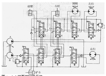 圖1.3-9為采用雙泵的挖掘機(jī)液壓系統(tǒng)簡圖。圖中泵A向動(dòng)臂液壓缸、斗桿液壓缸、回轉(zhuǎn)馬達(dá)及左行馬達(dá)供油,組成一獨(dú)聯(lián)回路;泵B向鏟斗液壓缸、動(dòng)臂液壓缸、斗桿液壓缸及右行馬達(dá)供油,組成另一獨(dú)聯(lián)回路,故為雙回路系統(tǒng)。這兩回路本身及兩回路之間都不互相干擾,從而使分屬于這兩回路中的任意兩機(jī)構(gòu)在輕載及重載時(shí)都能實(shí)現(xiàn)無干擾的同時(shí)動(dòng)作,提高挖掘機(jī)的生產(chǎn)率和發(fā)動(dòng)機(jī)的效率。